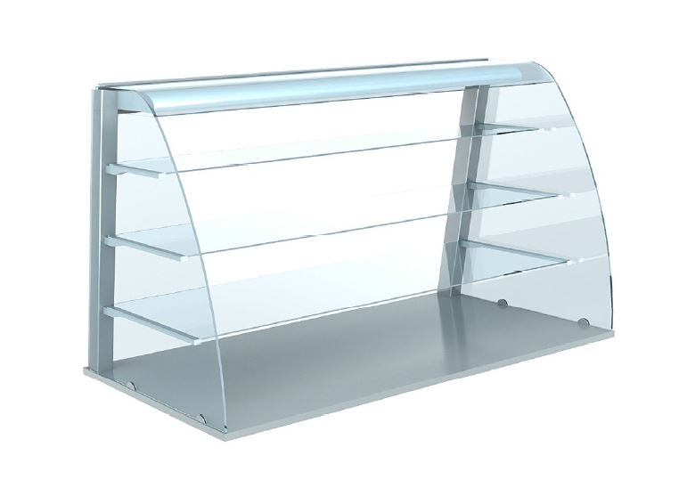 Vitrine neutre à clapets à poser. L’idéal pour pains, couverts, plateaux et verres. Ouverte côté service. Clapets côté client. Verres latéraux et supérieur trempés. Fond réalisé en acier inox AISI 304. 3 étagères en verre trempé. Éclairage intérieur à led. Peut être accessoirisée avec éclairage à led sous chaque étagère.