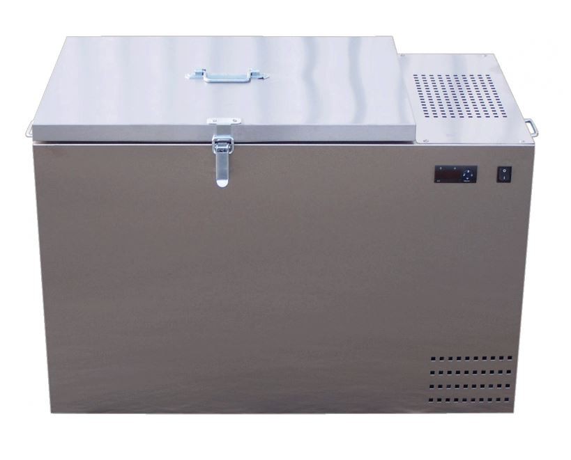Glacière réfrigérée 12/230 volts tout inox adaptée pour le transport médical, d'échantillons alimentaires ou de denrées alimentaires en respectant la chaîne du froid.
