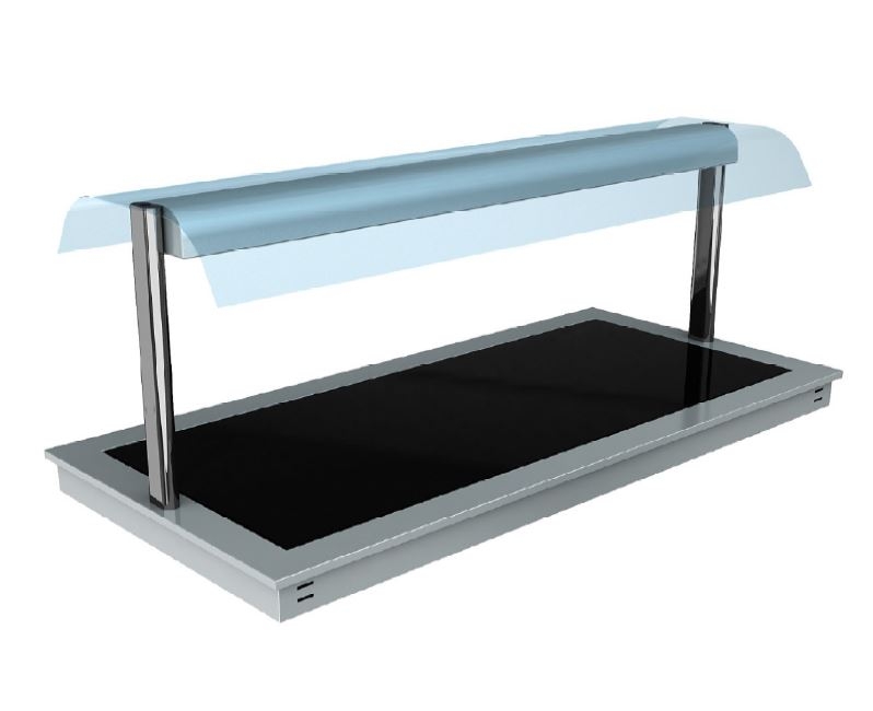 Plan de maintien au chaud encastrable, avec superstructure. Réalisé en verre trempé noir et acier inox AISI 304. Réglage de la température de 30°C ÷ 110°C par thermostat digital. Idéal pour présenter les aliments sur assiettes ou plateaux. Superstructure constituée de deux colonnettes en laiton chromé, d’un verre trempé galbé et d’une rampe d’éclairage et de chauffage par lampes infrarouges. Peut être accessoirisé avec verre frontal pare-haleine.