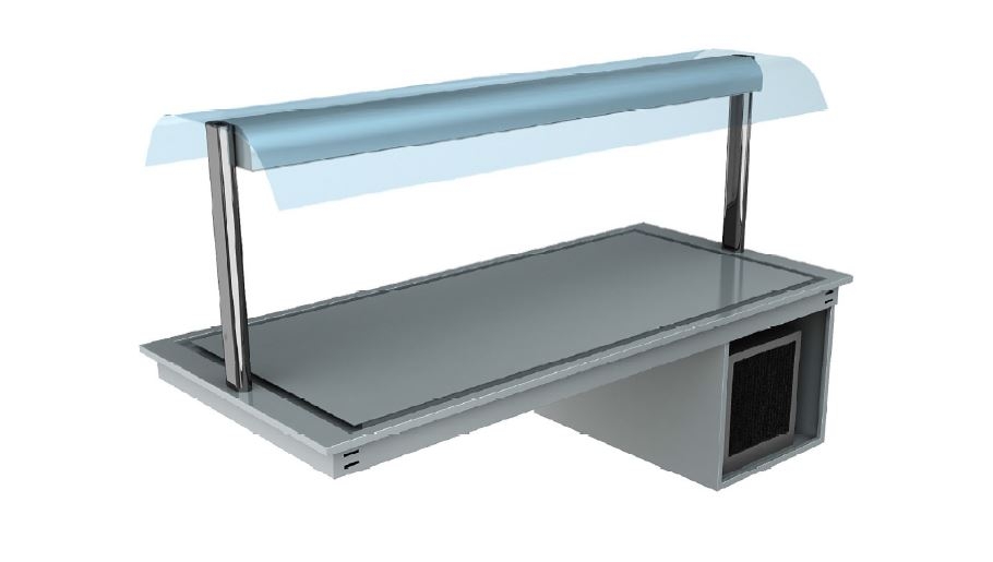Plan réfrigéré encastrable, avec superstructure. Groupe logé ou prédisposé pour groupe à distance. L’idéal pour présenter les aliments sur assiettes ou plateaux. Réalisé en acier inox AISI 304. Isolation par mousse de polyuréthane injectée, exempte de CFC et HCFC. Rigole périphérique pour le drainage des condensats. Réfrigération statique. Réglage de la température de +2°C ÷ +12°C par thermostat. Superstructure constituée de deux colonnettes en laiton chromé, d’un verre trempé galbé et d’une rampe d’éclairage à led. Peut être accessoirisé avec bac d’évaporation automatique des condensats et verre frontal pare-haleine.