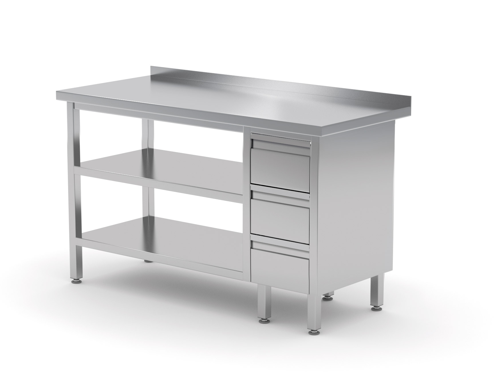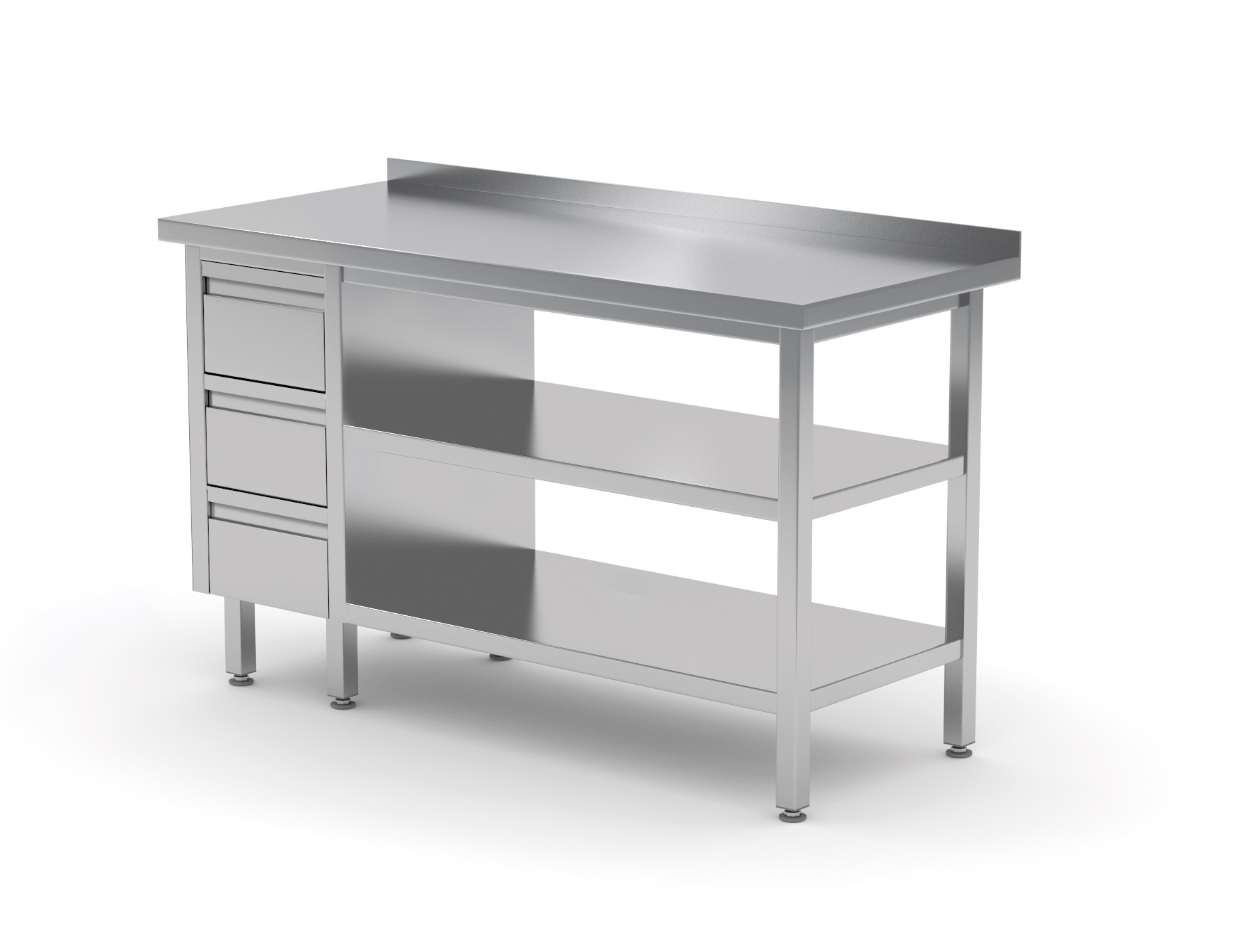 Table de travail avec dosseret, armoire avec trois tiroirs et tablette inférieure POL-125-3-2