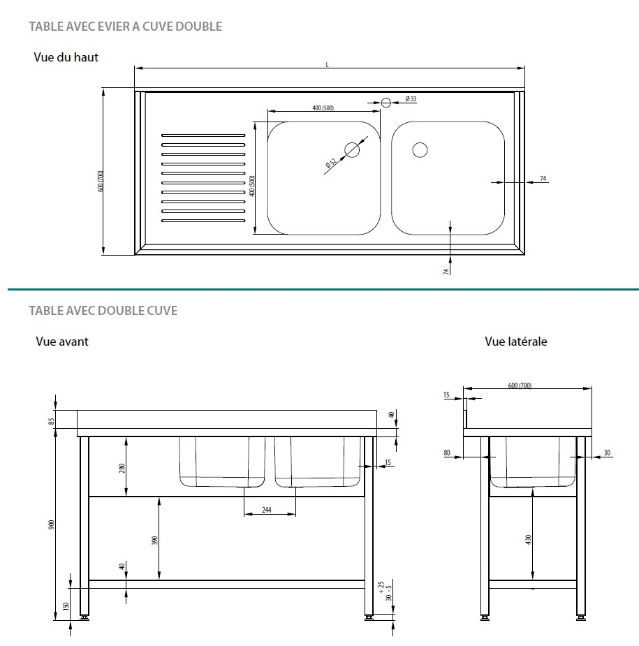 - les tables d'une profondeur de 700 mm et 800 mm ont une cuve mesurant 500x500x250 mm excepté les tables de 1200x700 mm et 1200x800 mm qui sont équipées de cuves de 400x500x250 mm