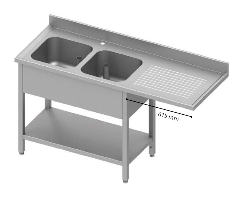 Table adossée avec double cuves à gauche et passage pour réfrigérateur ou lave-vaisselle