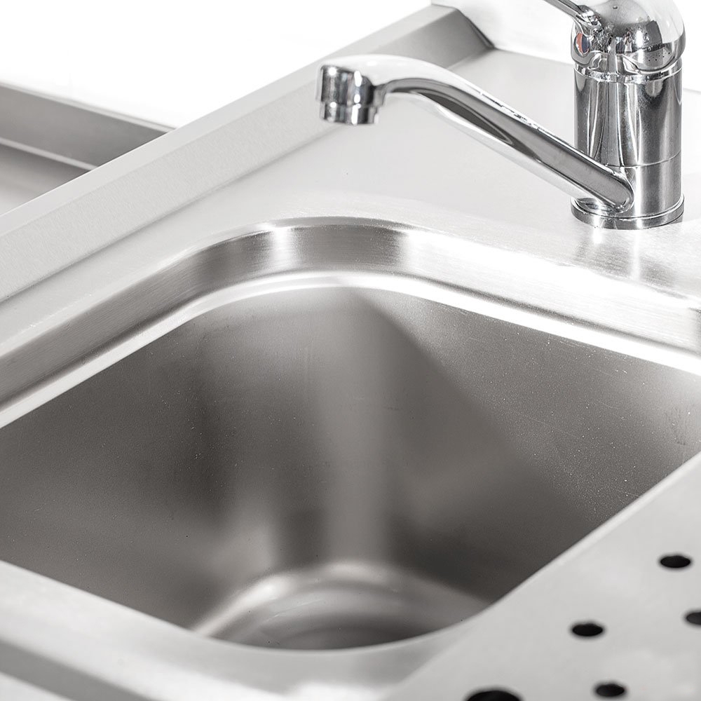 Cette table a un trou dans le comptoir et est dédiée à connecter la machine à café. Elle est entièrement en acier inoxydable, ce qui le rend très solide et facile à nettoyer. En standard, il dispose d'un lavabo avec égouttoir amovible, d'un tiroir à ustensiles, d'un meuble pour filtre adoucisseur d'eau et d'un tiroir incliné avec frein et reflet de marc de café. Table vendue sans piles.