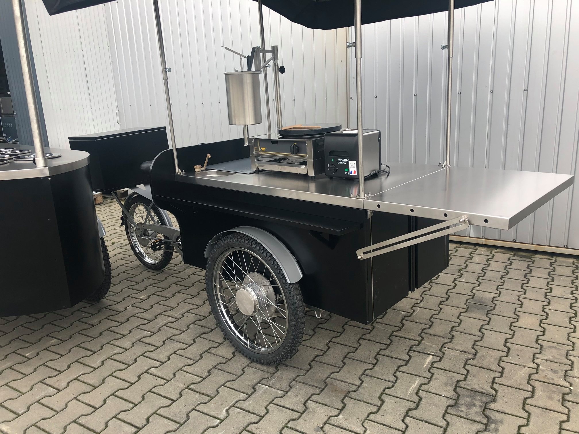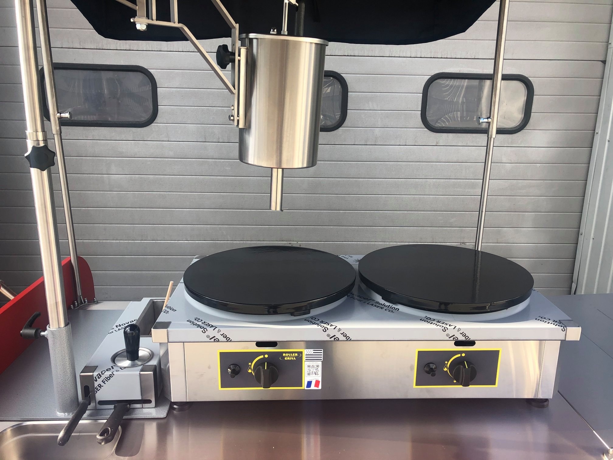 Le vélo à crêpe est spécialisé dans la vente d’un produit. Tous les appareils et accessoires de la partie supérieure sont disposés de manière à assurer un maximum de confort et d’efficacité. La vélo est équipée d’une machine à crêpes au gaz, d’une rehausse pour les produits supplémentaires, d’un organiseur pour les outils de préparation et de service des crêpes, d’un chauffage au chocolat et d’un distributeur de pâte. Grâce à l’ensemble des dispositifs, la vélo peut facilement faire face à une circulation intense et à la nécessité d’une grande efficacité.