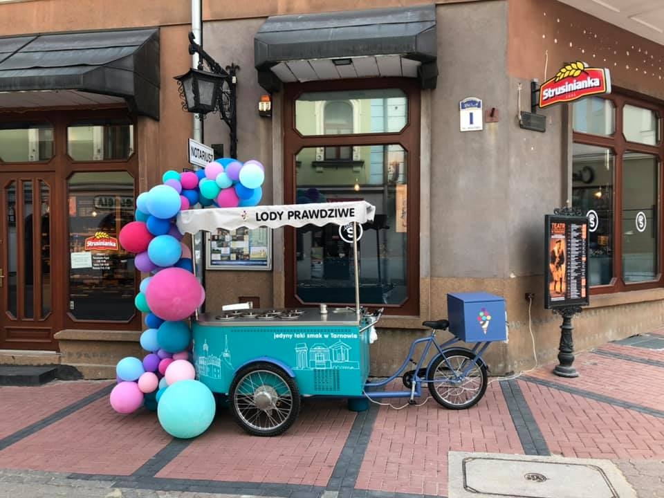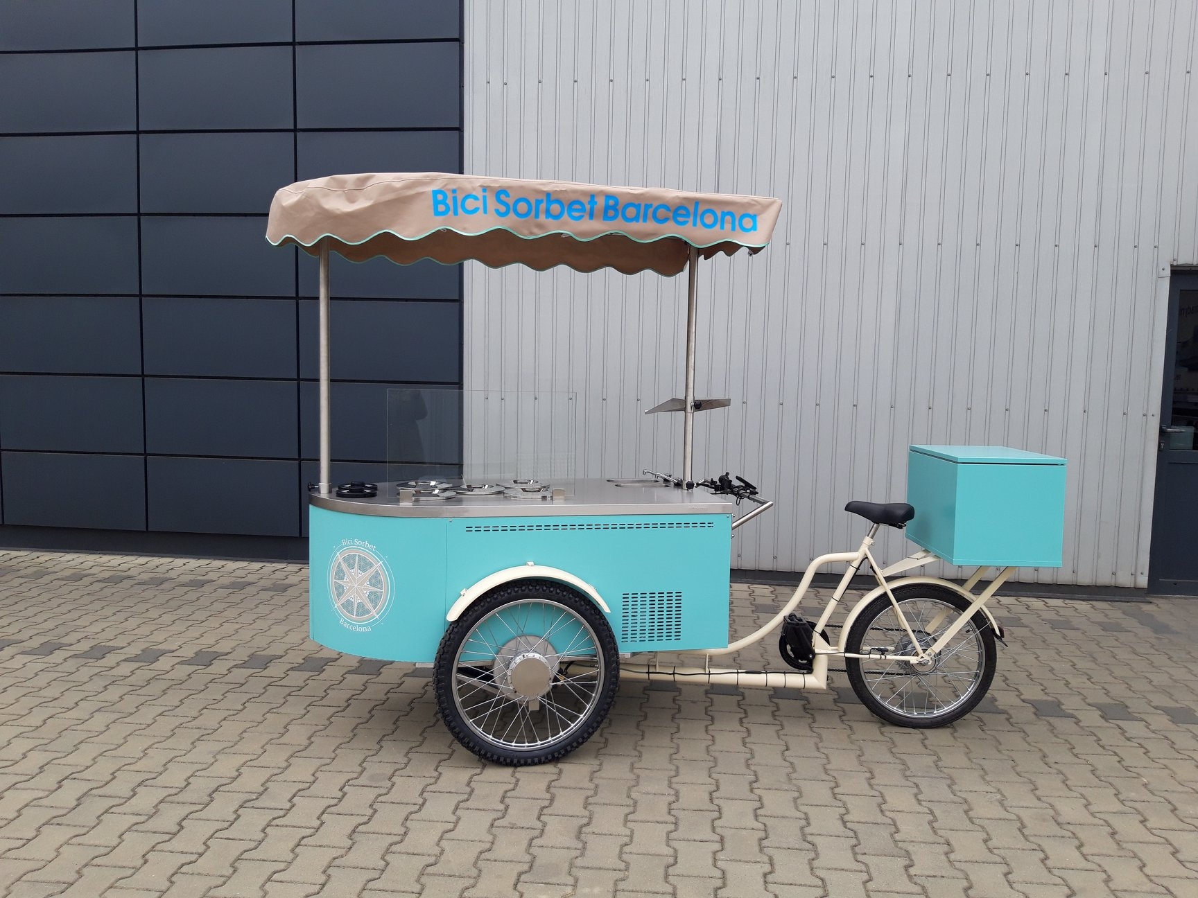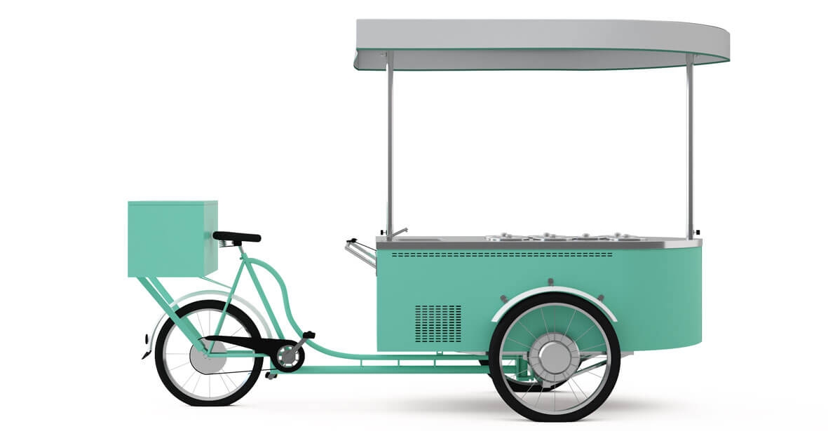 À l'arrière d'un vélo, nous avons conçu une boîte volumineuse dans laquelle vous pouvez stocker des gaufres à la crème glacée ou des coupes à glace pour toute la journée de travail.