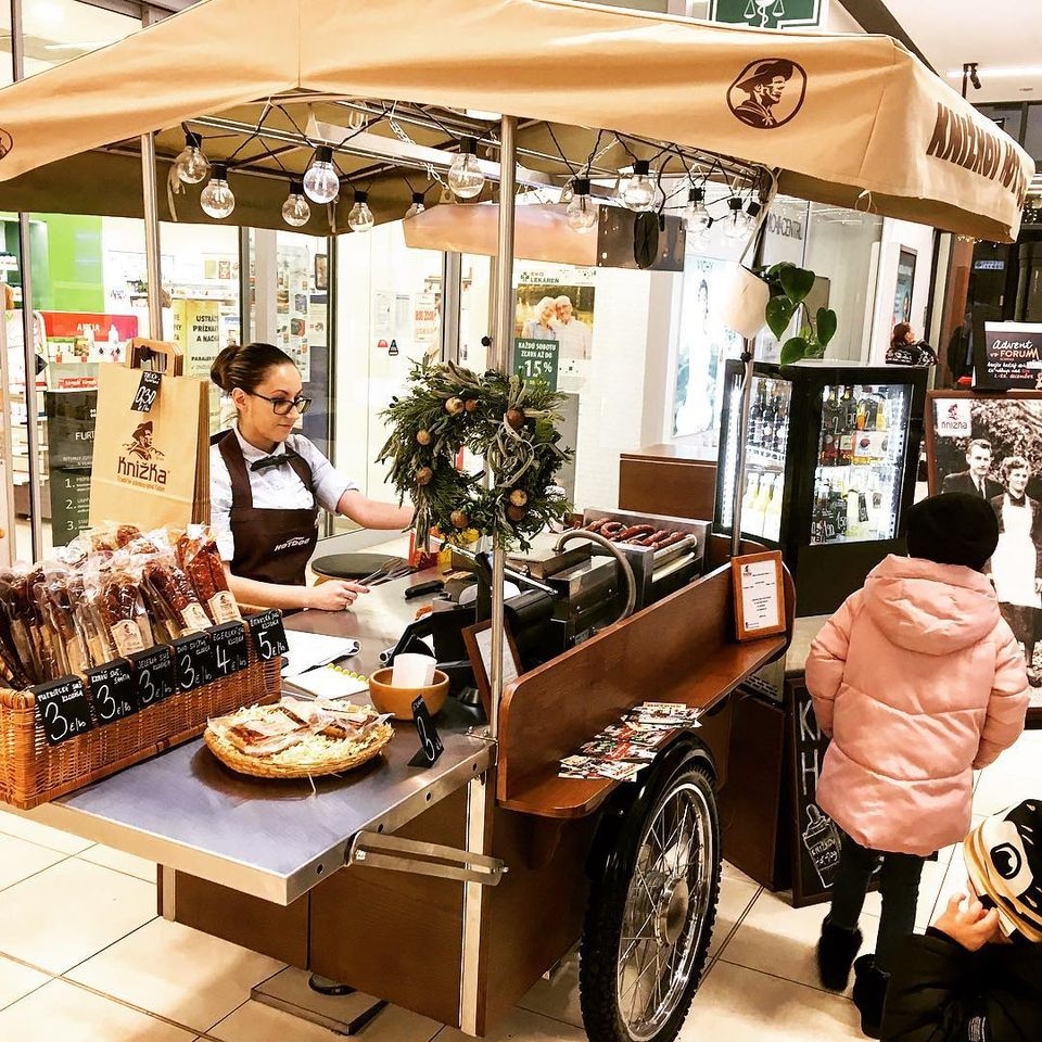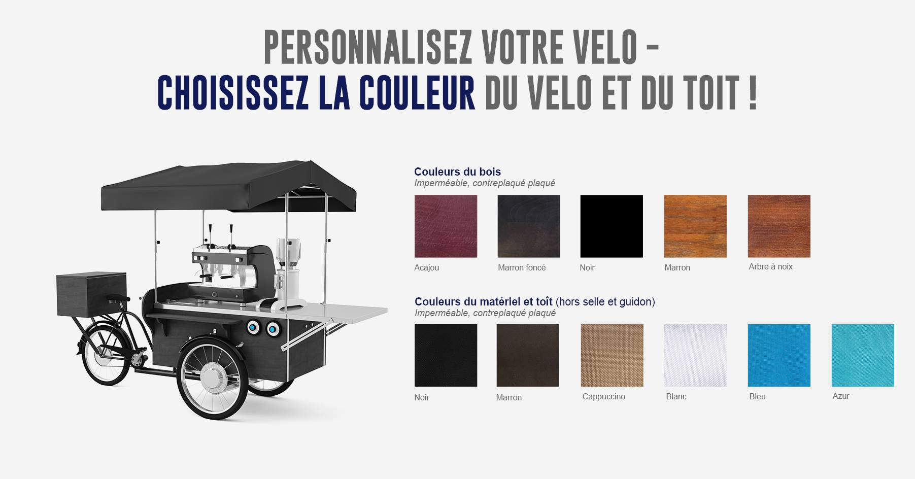 Équipements de restauration comme grill, machine à crêpes ou mixeur, accessoires comme vitrine, panneau publicitaire ou caisse à la place du porte-bagage; enfin nous choisissons l’installation électrique adéquate et le triporteur est prêt à servir.