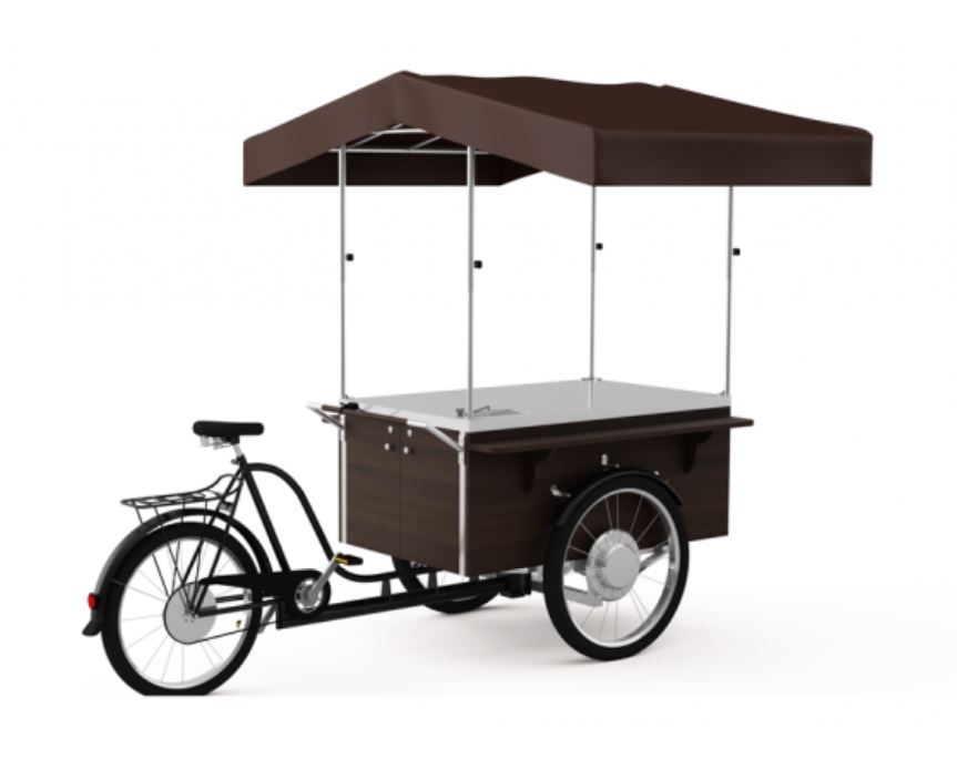 Le triporteur de restauration est l’alpha et l’oméga pour la conception de tous les autres. Équipé d’un toit pliant, d’un évier avec de l’eau, d’étagères latérales et d’une réserve spacieuse.