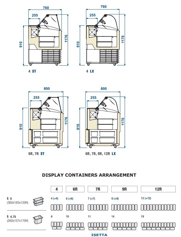 Corps monobloc avec isolation polyuréthane écologique (sans HCFC et HFC), mousse de C02. Cuve interne et externe en tôle plastifiée. Cette armoire peut être équipée d'un double niveau de bacs à glace H120 et elle est équipée d'une cellule de stockage avec évaporateur interne en mousse (sauf pour le modèle ISETTA 4). Structure en verre trempé, disponible en deux versions, ST (verre frontal droit) ou LX (verre frontal bombé). Système de panneau arrière pivotant en méthacrylate côté opérateur. Plan de travail en tôle plastifiée avec éclairage led interne. Unité de condensation hermétique intégrée avec tableau de commande électronique. Disponible en modèle Special Performance TP fonctionnant en classe 7, 35 ° C, 75 HR. Structure principale en acier au carbone peint à la poudre, 4 roues pivotantes pour une manipulation plus facile.