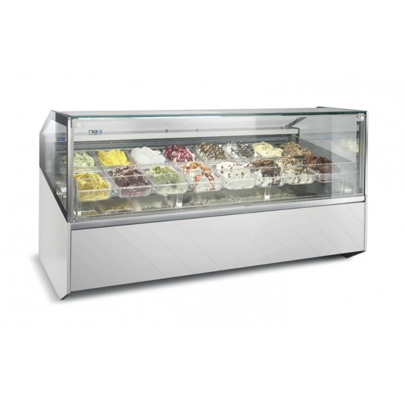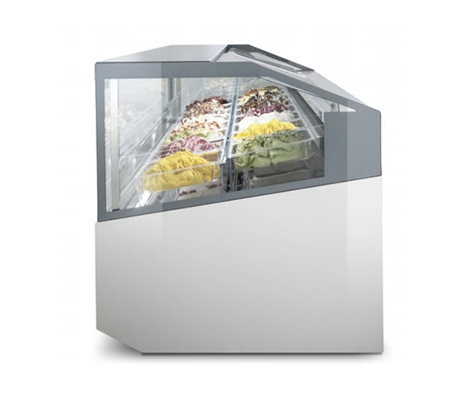 Supershow est le format idéal pour maximiser l'attrait d'affichage de la crème glacée artisanale. Il améliore l'affichage tridimensionnel du produit et offre une vue impressionnante sous tous les angles grâce à l'avant et aux côtés de la vitrine, ainsi que les cuves à crème glacée, le tout étant complètement transparent.