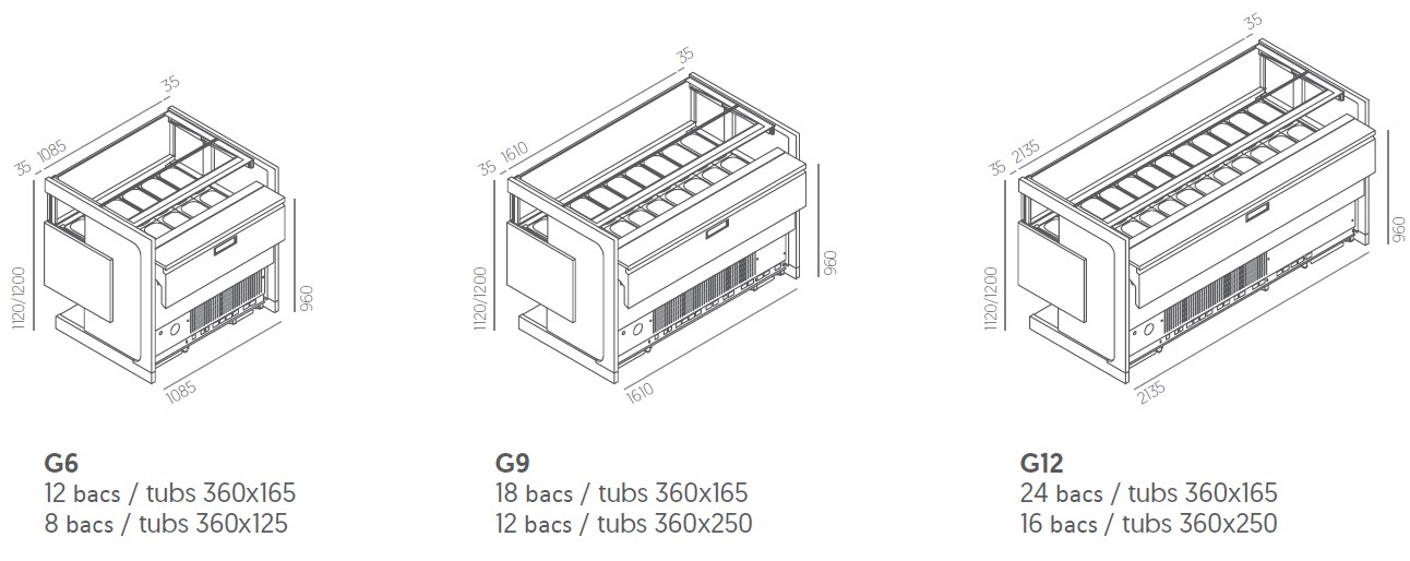 12 bacs de 360x165 mm ou 8 bacs de 360x125 mm