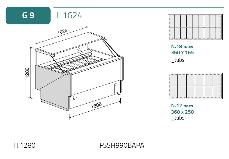 18 bacs de 360x165 mm ou 12 bacs 360x250 mm max