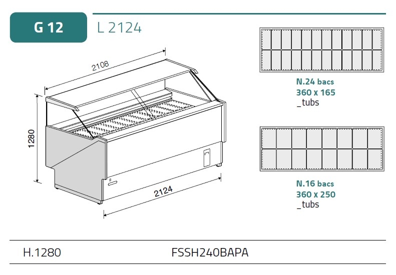 12 bacs de 360x165 mm ou 8 bacs de 360x250 mm max